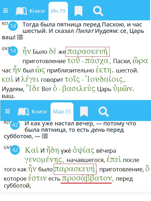 • Ин. 19:14 – «παρασκευὴ τοῦ πάσχα» (день приготовления Пасхи).
