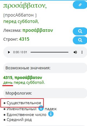 • Ин. 19:31 – «ἦν γὰρ μεγάλη ἡ ἡμέρα ἐκείνου τοῦ σαββάτου» — уточнение, что Суббота была великая, а день до неё — Παρασκευή.Везде это именно существительное.