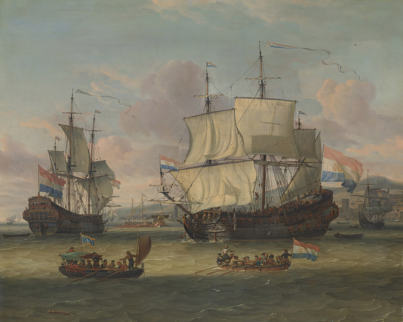 Либо это Голландские корабли, либо это Русские корабли с двойным флагом, что требовалось для того, чтобы их можно было отличить от голландских кораблей, ведь один из двух русских флагов полностью идентичен голландскому.
