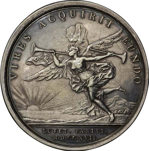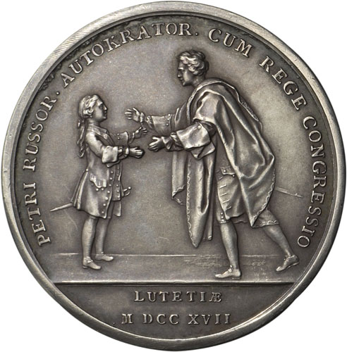 "Пётр решил личным визитом придать динамику русской дипломатии. Визит царя произвёл во Франции большой резонанс и послужил темой нескольких медалей.