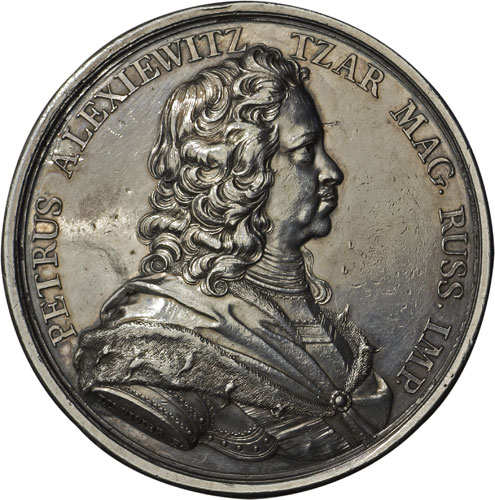 Аверс: Погрудное изображение Петра I в парике, доспехах и горностаевой мантии.
