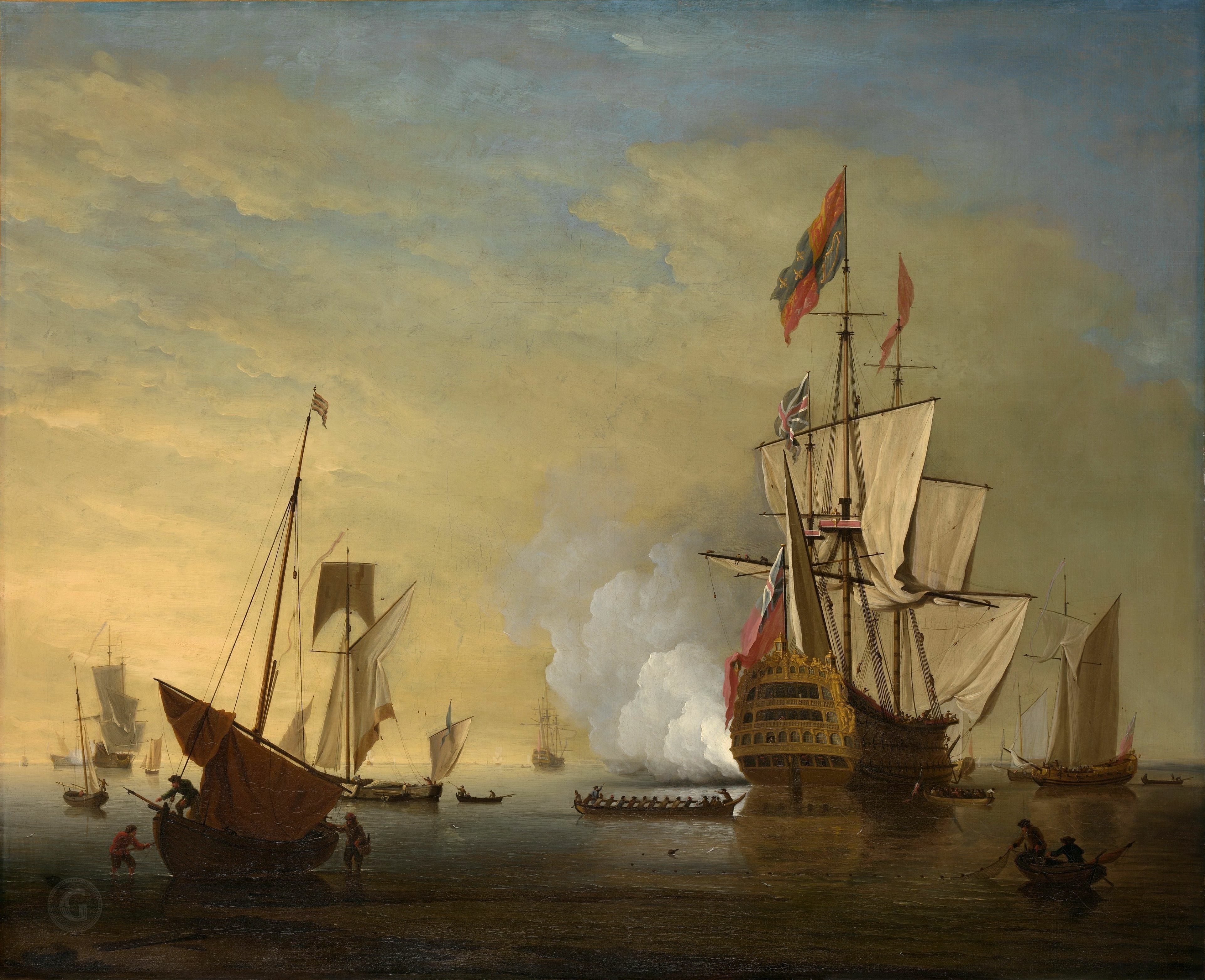 "Английский военный корабль стоит в укреплённой континентальной гавани, флагманский корабль даёт салют."