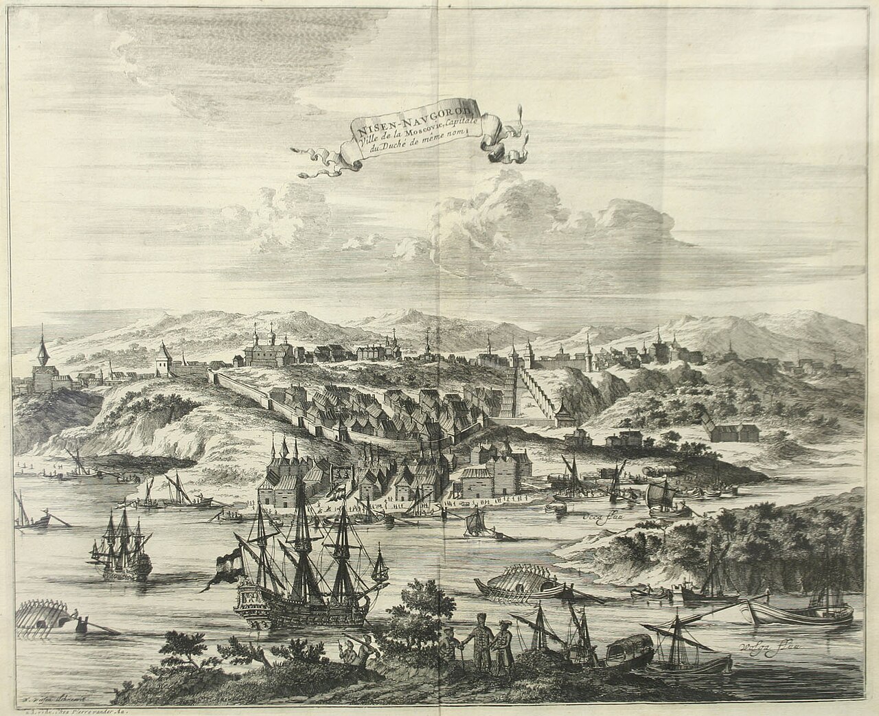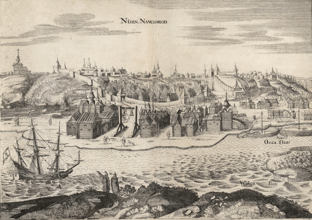«Корабль «Фредерик» у Нижнего Новгорода в 1636 году. Гравюра из книги Адама Олеария «Подробное описание путешествия в Московию и Персию». Шлезвиг, 1656 год.