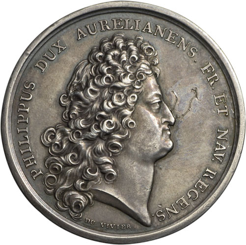 1. Аверс: Голова Филиппа, герцога Орлеанского, регента молодого короля Людовика XV.
