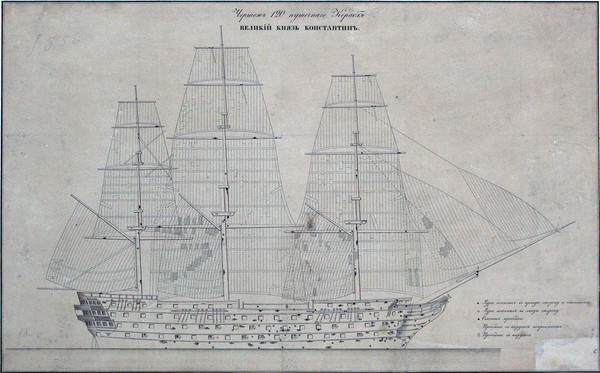 Кто-то "поработал" над большими красными флагами на этой картине, и остался только косой красный крест, а прямой красный крест "подкорректировали", то есть удалили. Мы видим здесь одтн из тех самых больших линейных кораблей -- гордость русского флота. Возможно, это корабль "Иоанн Златоуст", если "поиск" в яндексе не ошибается.