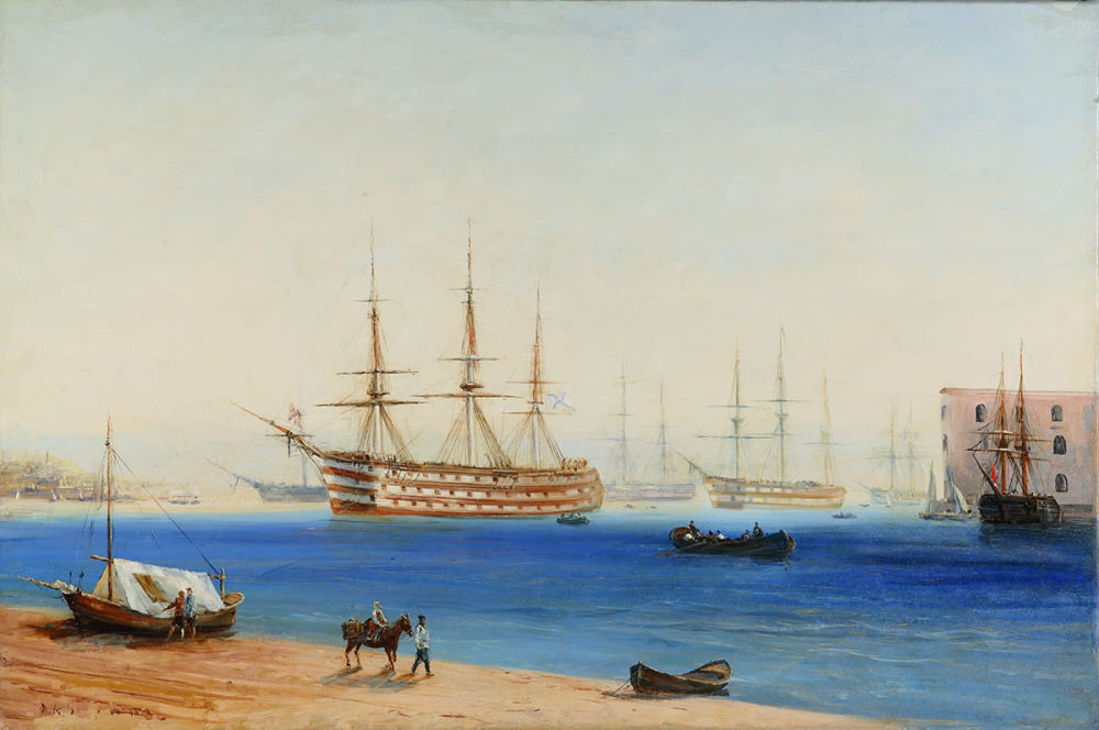 Главный город и порт романтического островного рыцарского государства привлек художника возможностью изобразить воду и множество разнообразных судов и суденышек, сконцентрированных в оживленной гавани: здесь и стопушечный военный корабль, и шхуны, и яхты, и шлюпки, а также небольшой пароход, подобный тому, который курсировал с 1830-х годов вдоль побережья родного художнику Крыма.
