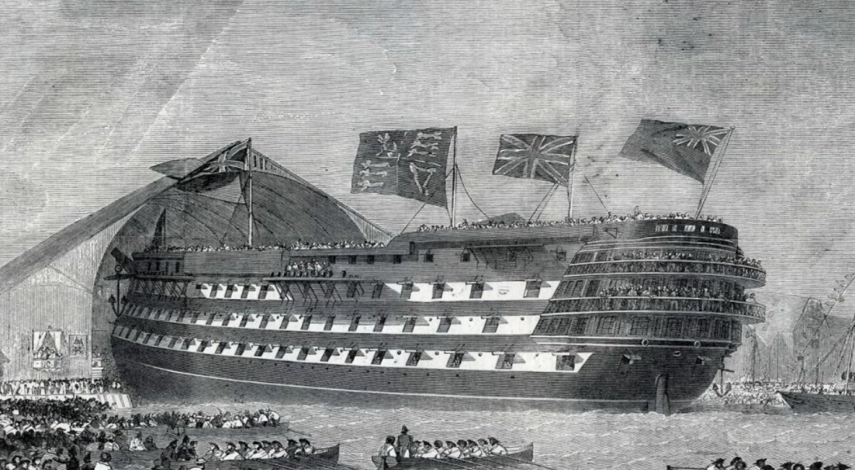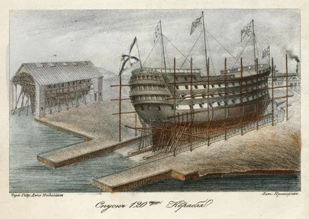 Русский: Линейный корабль «Двенадцать Апостолов» на стапеле адмиралтейства. Литография В.А.Прохорова