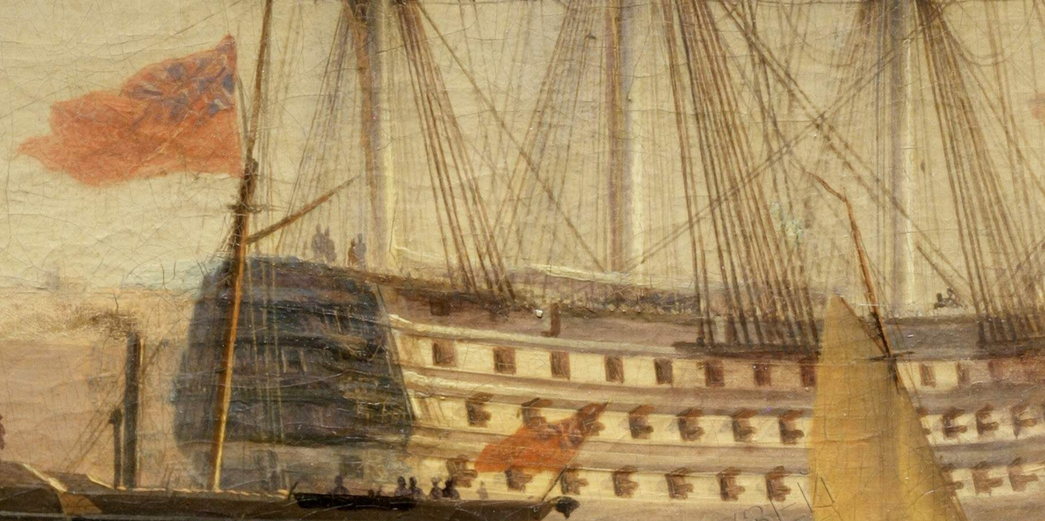 Очень странно, что на картине отсутствуют флаги, в отличии например от подобных картин Питера Монами, где они очень хорошо показаны. Не может ли оказаться, что они будут видны под рентгеном? Это возможно, потому что судя по картинам Айвазовского он не был сторонником деятельности Николая Первого.