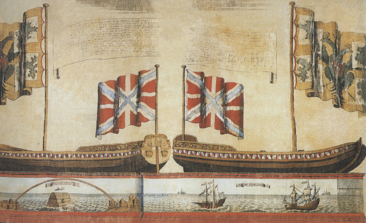 Русский: Раскрашенная гравюра на шёлке (плат) «Ботик Петра I» из собрания ЦВММ после реставрации