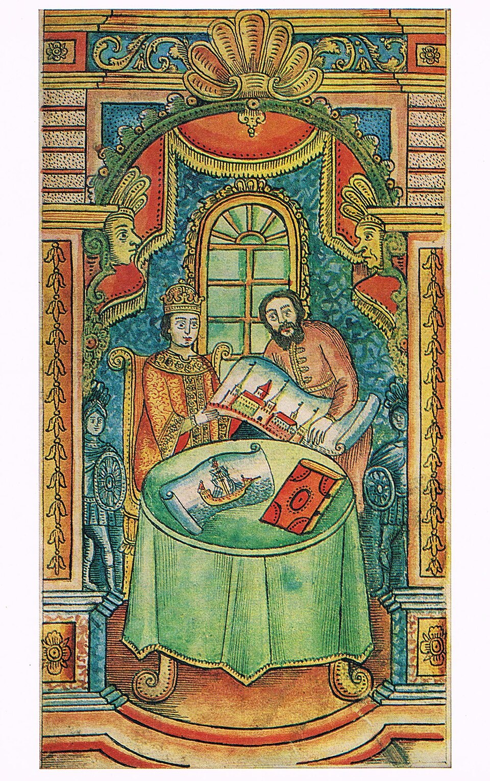 Никита Зотов обучает Петра I разным наукам. Миниатюра из Истории Петра I П. Крекшина.