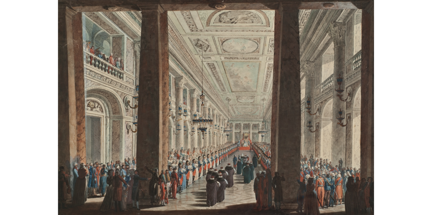 "Представлен торжественный прием императрицей Екатериной II Чрезвычайного и полномочного посла Оттоманской порты Россих-Мустафы-паши, состоявшийся 13 октября 1793 года в Большом зале Зимнего дворца. По случаю окончания русско-турецкой войны 1787–1791 годов посол поднес императрице драгоценные подарки (cм.: Камер-фурьерский журнал 1793 г. СПб, 1892. С. 793, 804–808). Проект отделки Большого зала (архитектор Джакомо Кваренги) относится к 1791–1793; после пожара 1837 зал был реконструирован Василием Стасовым; с 1856 стал называться Николаевским.