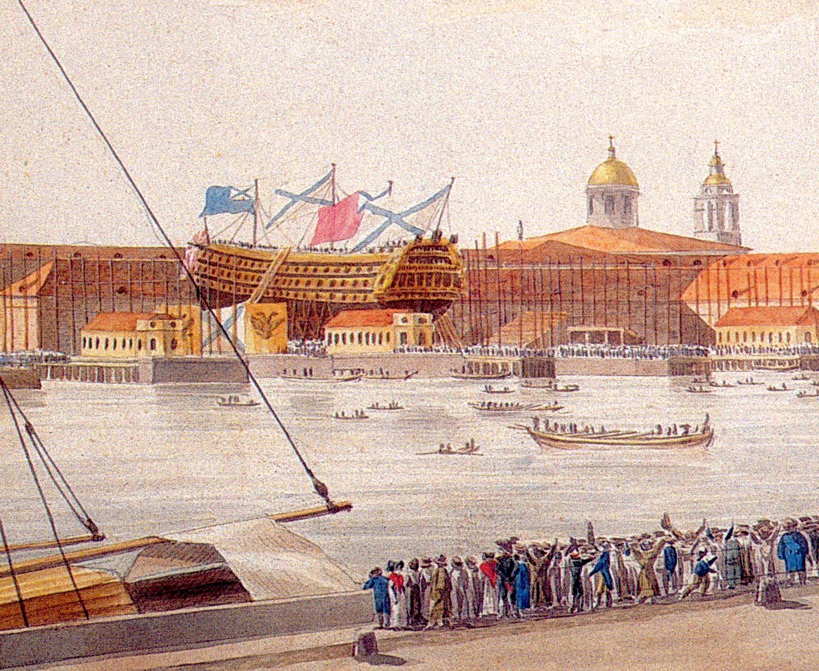 "В XVIII веке в Санкт-Петербурге проводились торжественные церемонии спуска кораблей на воду в Адмиралтействе — комплексе адмиралтейских построек на 2-м Адмиралтейском острове на берегу реки Нева."