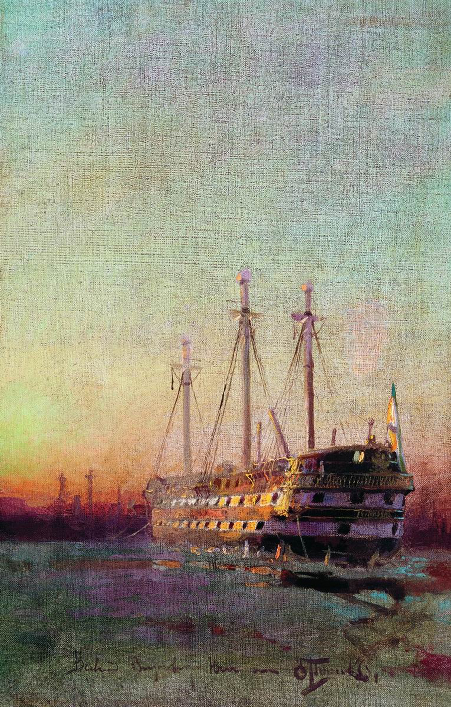 Спуск большого корабля, который строился на глазах у многих и его можно было видеть с набережной, -- это большое событие, и должны были быть хорошие цветные картины художников, на которых показано это событие, и много картин. Но их почти нет... Это очень странно. Можно сделать вывод, что многие замечательные картины, рассказывающие об этом событии, таинственным образом куда-то исчезли в мятежное время.