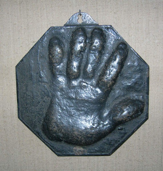 На обратной стороне восьмигранника выпуклый текст: «Снимок с оттиска руки Петра Великого сделанного им на песке в основанном им же чугуно-литейном заводе в 1707 г. в г. Липецке. Подлинник хранится в здании Липецких минеральн. вод. Исп. на заводе Бр. Миловановых в Липецке».