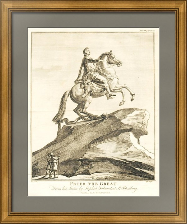 "Небольшой монумент с французской надписью на пьедестале («Петр-Созидатель») некогда принадлежал известному коллекционеру и меценату графу А. С. Строганову (1733–1811). Его можно различить на семейном портрете Строгановых (ГЭ), исполненном в Париже не позднее 1788. Автором, скорее всего, был французский скульптор, который опирался в своей работе на известные в то время памятники королю Людовику XIV. Один из них, созданный по модели Ф. Жирардона был поставлен в 1699 в Париже, другой, работы М. Дежардена, — в 1715 в Лионе (оба были разрушены в 1792–1793 во время французской революции)."