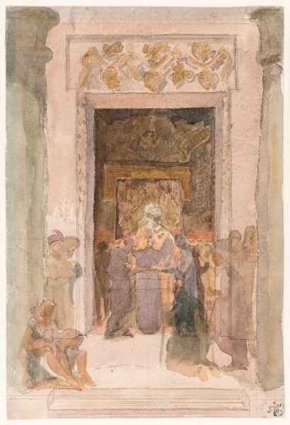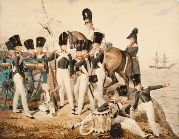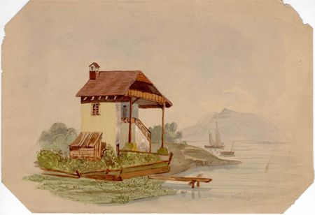 Это было послемятежное время. Флаг в европейской части России был восстановлен совсем недавно. Для многих он воспринимался как чудо. Может поэтому он висит в небе, как что то вроде божественного дара. Я думаю, что до корректировки этой акварели, а она корректировалась, что видно по флагу на мачте, это был Русский флаг с его цветами (сверху вниз): красный, белый, синий.