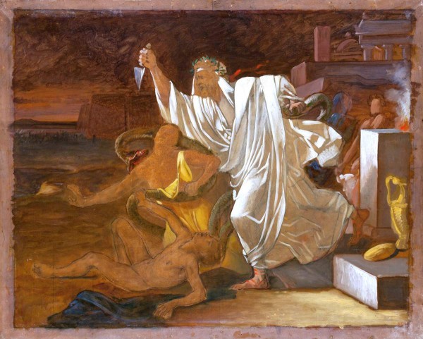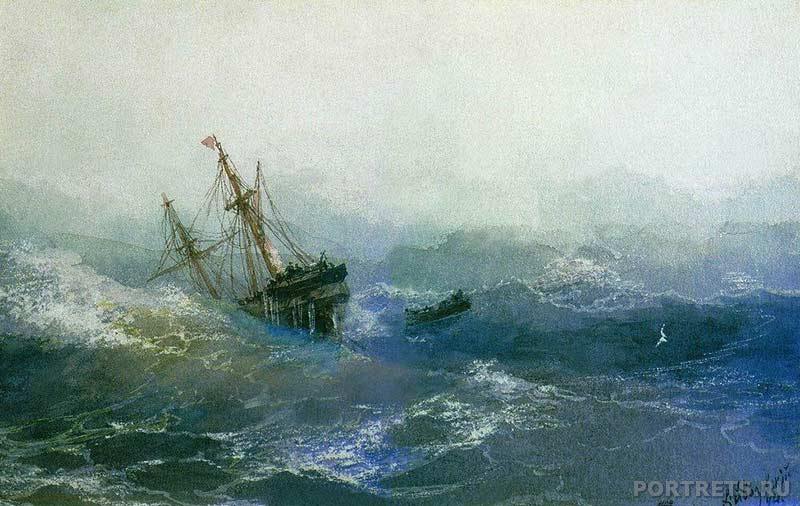 Живописец изображает море в момент сильного шторма и людей, потерпевших кораблекрушение. Волна накрыла корабль почти полностью и готова обрушиться на людей, пытающихся спастись на мачте.
