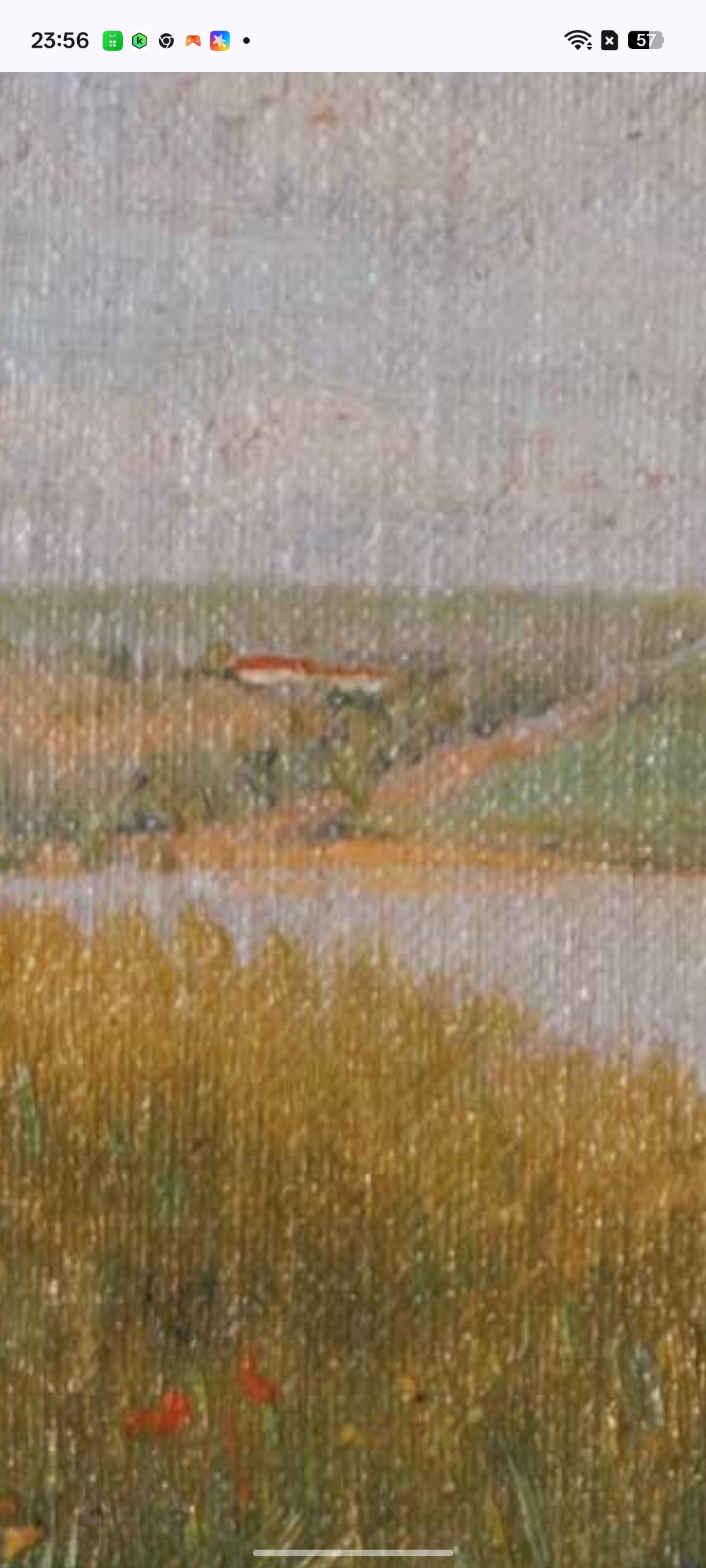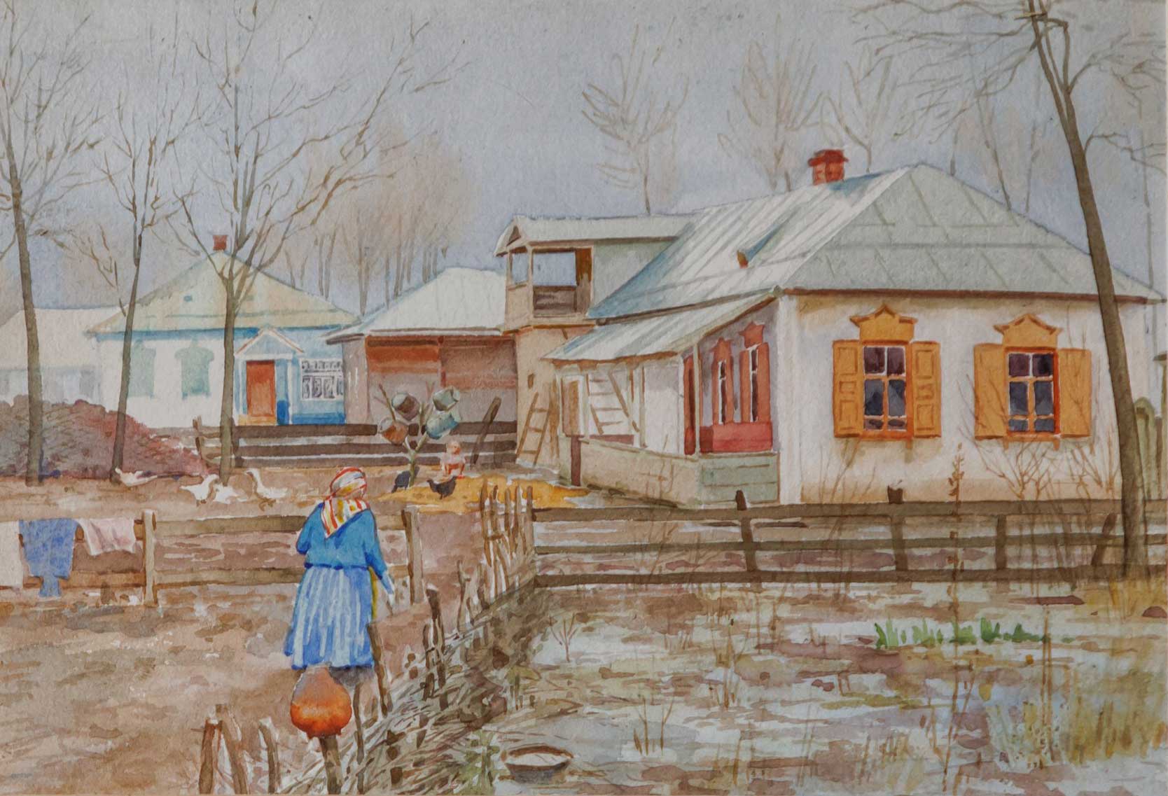 На этой картине тоже все пронизано цветами Русского флага: красная крыша, белые стены, синяя река и зеленая трава.