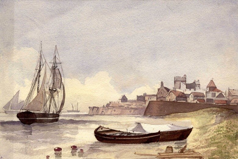 И на этой картине тоже изображён флаг. И снова красные цвета на крыше и белая стена. Причем достаточно хорошо видно, что сам флаг на этом рисунке был откорректирован фальсификаторами истории. По крайней мере, мне показалось, что верхняя полоса на нем изображена белой, чего не могло быть.