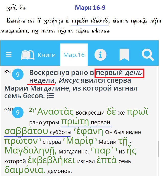 А μία τῶν σαββάτων — на "первый день недели", чтобы подвести календарь под ложное воскресение в воскресенье (установление собора 4 век), а не в Субботу, в Пасху, 14 нисана, как по Писанию.