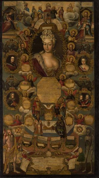 "Екатерина I (Марта Самуиловна Скавронская, Екатерина Алексеевна Михайлова; 5/15 апреля 1684 − 6/17 мая 1727, Санкт-Петербург) − вторая жена Петра I Великого, российская императрица с 1721 как супруга царствующего императора, с 1725 как правящая государыня; мать императрицы Елизаветы Петровны. В ее честь Петром I учрежден орден Св. Екатерины (1713) и назван город Екатеринбург на Урале (1723). Имя Екатерины I носит также Екатерининский дворец в Царском Селе (выстроенный при ее дочери Елизавете). Царствовала с 28 января / 8 февраля − 1725 по 6/17 мая – 1727. 400-летие Дома Романовых. СПб, 2013. С. 110.