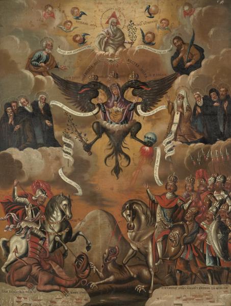 В центре — двуглавый орел, на нем фигура Богоматери с Младенцем (тип иконы «Знамение»). Крылья орла расположены за спиной Богоматери, над ней текст из Апокалипсиса: «И дана быша жене два крыла орла великаго» (Откр. 12, 14) и «Знамение множества мира». Ниже: «Здевселюся яко изволих».