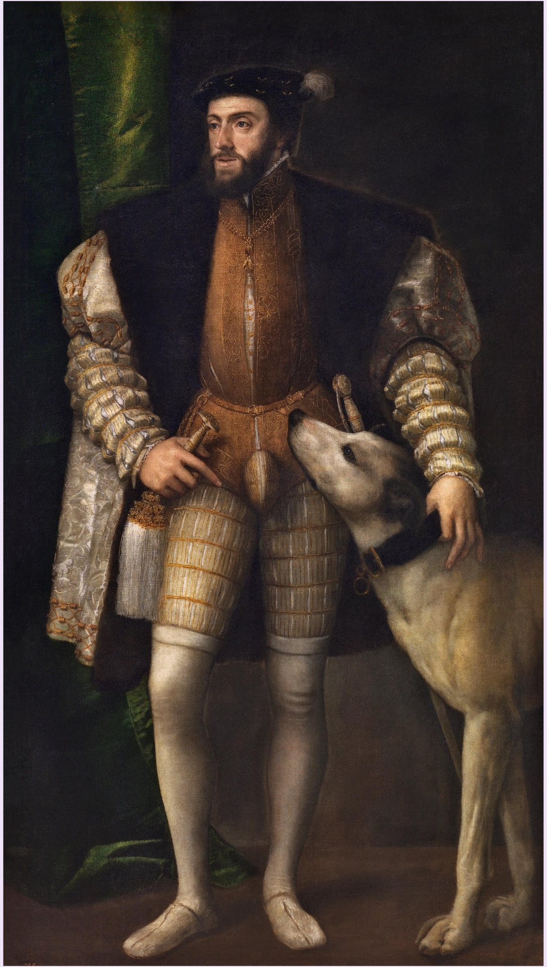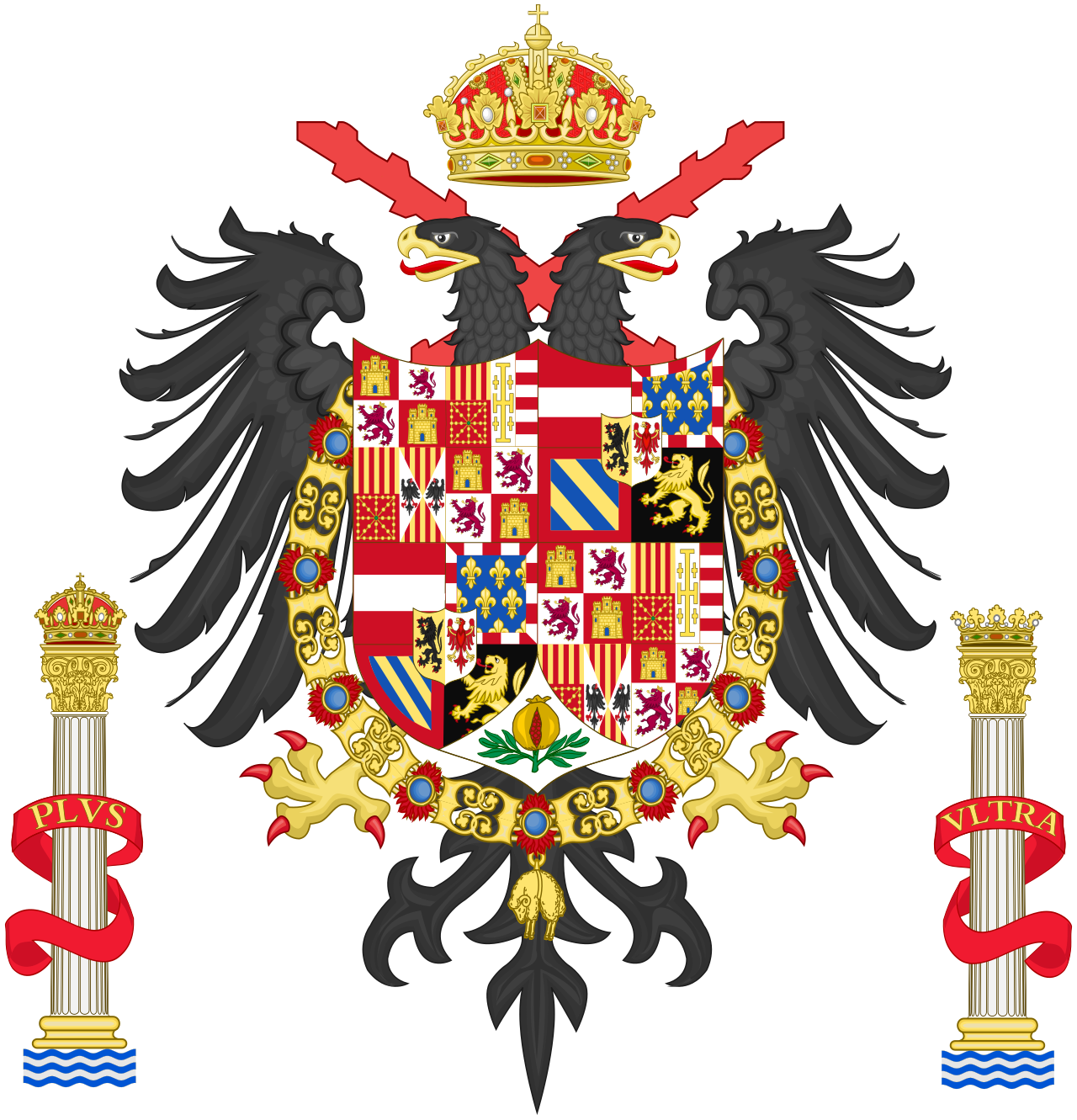 "Он сам называл себя сложно: «Избранный император христианского мира и Римский, присно Август, а также католический король Германии, Испаний и всех королевств, относящихся к нашим Кастильской и Арагонской коронам, а также Балеарских островов, Канарских островов и Индий, Антиподов Нового Света, суши в Море-Океане, Проливов Антарктического Полюса и многих других островов как крайнего Востока, так и Запада, и прочая; эрцгерцог Австрии, герцог Бургундии, Брабанта, Лимбурга, Люксембурга, Гельдерна и прочая; граф Фландрии, Артуа и Бургундии, пфальцграф Геннегау, Голландии, Зеландии, Намюра, Руссильона, Серданьи, Зютфена, маркграф Ористании и Готциании, государь Каталонии и многих других королевств в Европе, а также в Азии и Африке господин и прочая».Гербом Карла были геркулесовы столбы — путь Европы к заморским странам; девизом — plus ultra — «всё дальше»