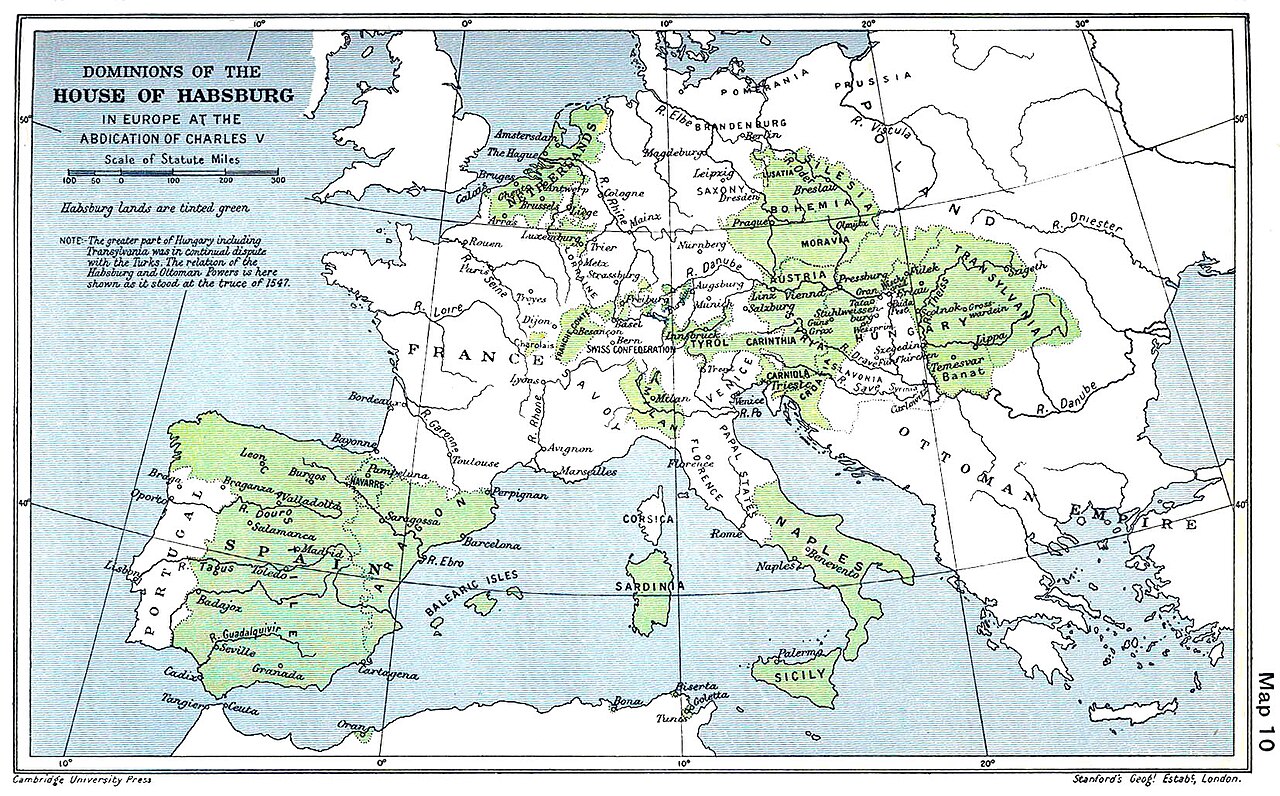 "Карл V Габсбург (лат. Carolus V, нид. Karel V, нем. Karl V., фр. Charles Quint; 24 февраля 1500, Гент, Габсбургские Нидерланды — 21 сентября 1558, Юсте, Королевство Кастилия и Леон) — король Испании (Кастилии и Арагона) под именем Карлос I (исп. Carlos I) с 23 января 1516 года, король Германии (римский король) с 28 июня 1519 (коронован в Ахене 23 октября 1520 года) по 1556 год, император Священной Римской империи с 1520 года (коронован 24 февраля 1530 года в Болонье папой римским Климентом VII). Крупнейший государственный деятель Европы первой половины XVI века, внёсший наибольший вклад в историю среди правителей того времени. Карл V — последний император, официально коронованный римским папой, он же — последний император, отпраздновавший в Риме триумф. Правитель первой в мире трансатлантической империи."