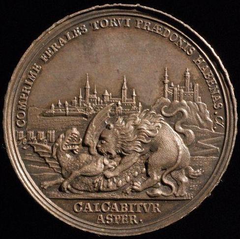 "Шведский лев ниспровергает дракона, олицетворяющего Россию. На заднем плане - Нарва и Иван-город.