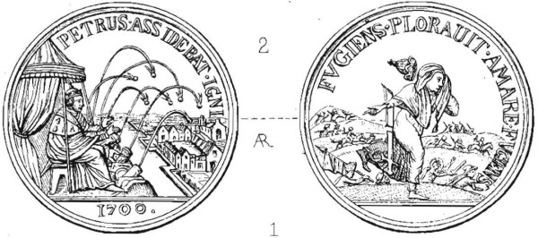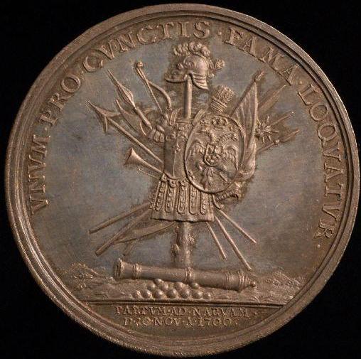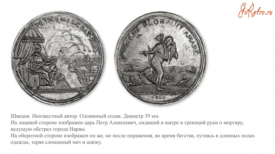 "Были отчеканены и несколько сатирических медалей. Фотографий их мне не удалось найти. Но прорисовки есть у Нордберга. Эта содержит довольно кощунственный по тем временам намёк на историю с Апостолом Петром, отрёкшимся от Христа. Она изображает царя Петра в шатре на троне, греющим руки у пушек, бомбардирующих Нарву. Латинская надпись воспроизводит строку Евангелия: