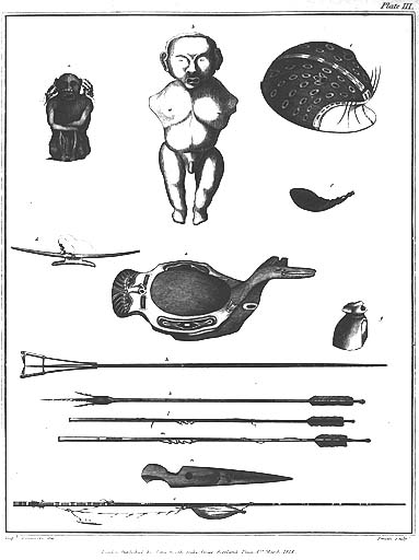 Предметы культа и оружие аборигенов Кадьяка. Гравюра из английского издания отчёта Лисянского.