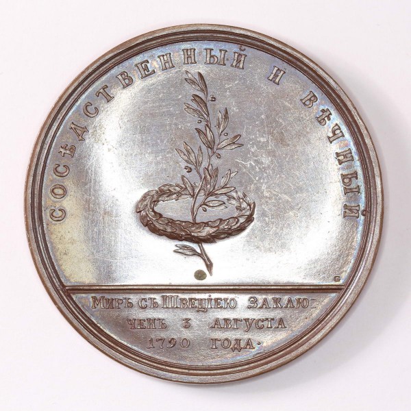 На лицевой стороне портрет Екатерины II в короне, лавровом венке, мантии поверх чешуйчатого панциря. На оборотной стороне лавровый венок с продетой сквозь него масличной веткой, вверху по кругу «СОСЕДСТВЕННЫЙ И ВЕЧНЫЙ», в обрезе «МИРЪ СЪ ШВЕЦIЕЮ ЗАКЛЮ-ЧЕНЪ 3 АВГУСТА 1790 ГОДА».