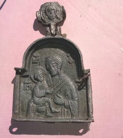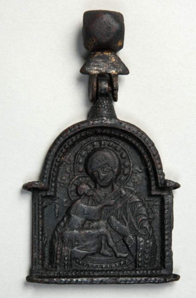 Нагрудный складень-змеевик в форме киотца (створки утрачены). Граненое оглавие соединено подвижно. Представленная в киотце композиция – Богоматерь, несколько склонившая голову к младенцу, которого она держит в правой руке. Левая рука младенца, видимо, охватывает ее шею, правая – лежит на мафории. Ножки младенца высоко обнажены и перекрещены. Изображение сопровождается надписями. Края одежд и край складня орнаментированы имитацией зерни.