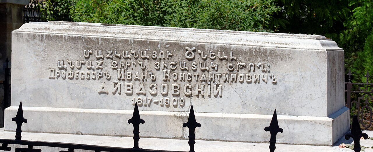 В 1903 году вдова художника Анна Бурназян установила на могиле мужа надгробие в форме саркофага из цельного блока белого мрамора. На одной из сторон саркофага на древнеармянском языке написаны слова историка V века Мовсеса Хоренаци: «Մահկանացու ծնեալ անմահ զիւրն յիշատակ եթող» — «Рождённый смертным, оставил по себе бессмертную память» и дальше на русском — «Профессоръ Иванъ Константиновичъ АЙВАЗОВСКІЙ 1817—1900»."
