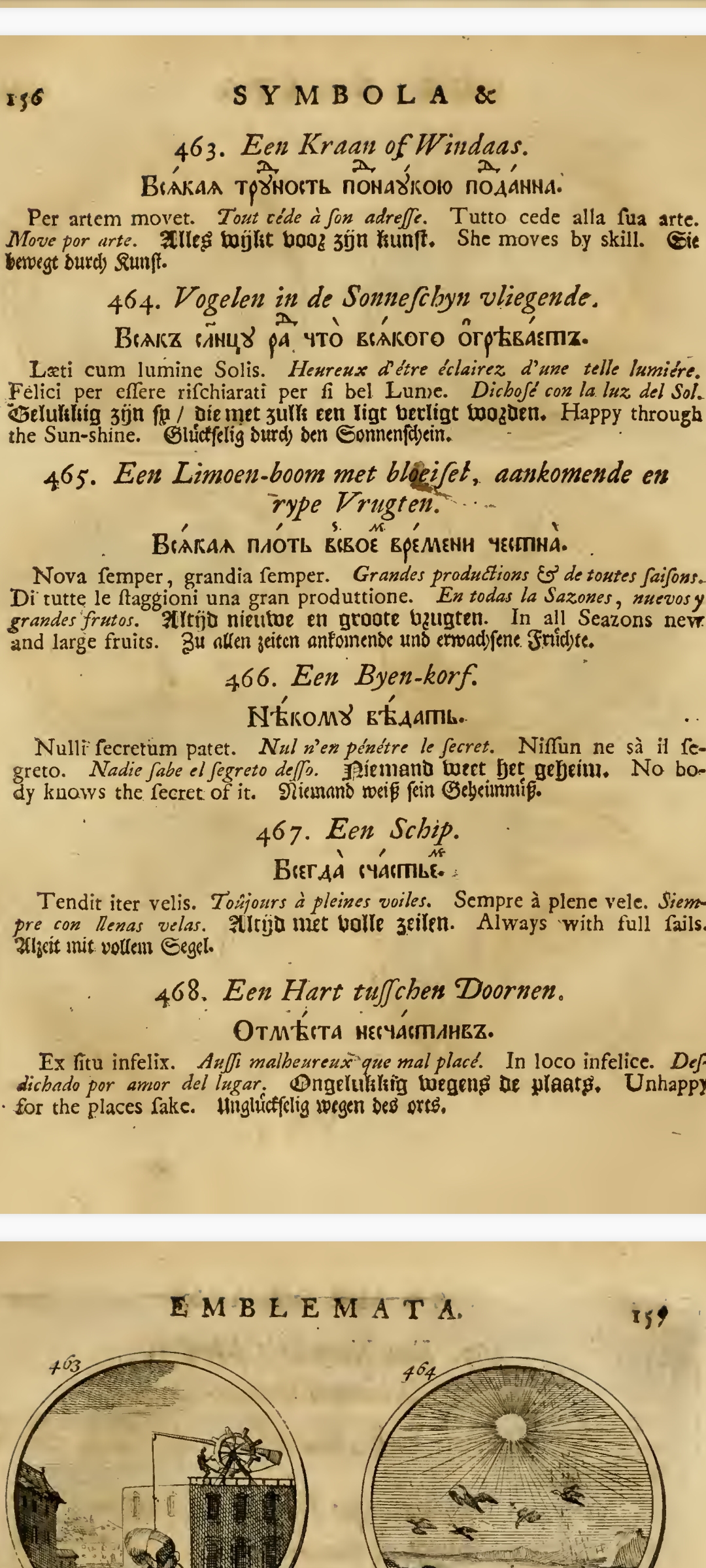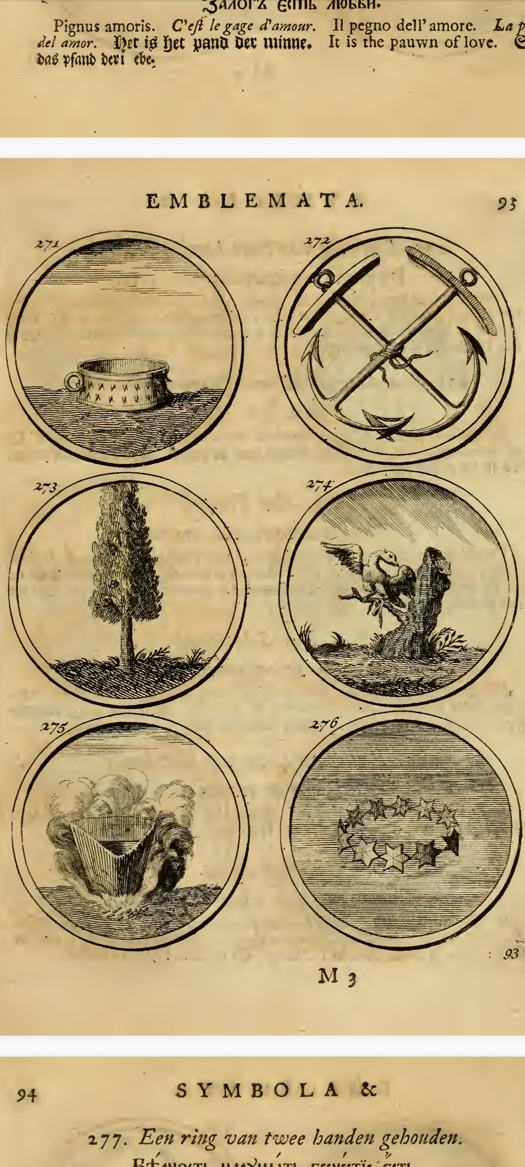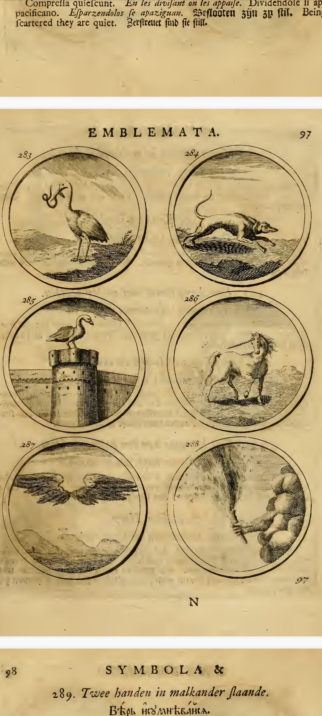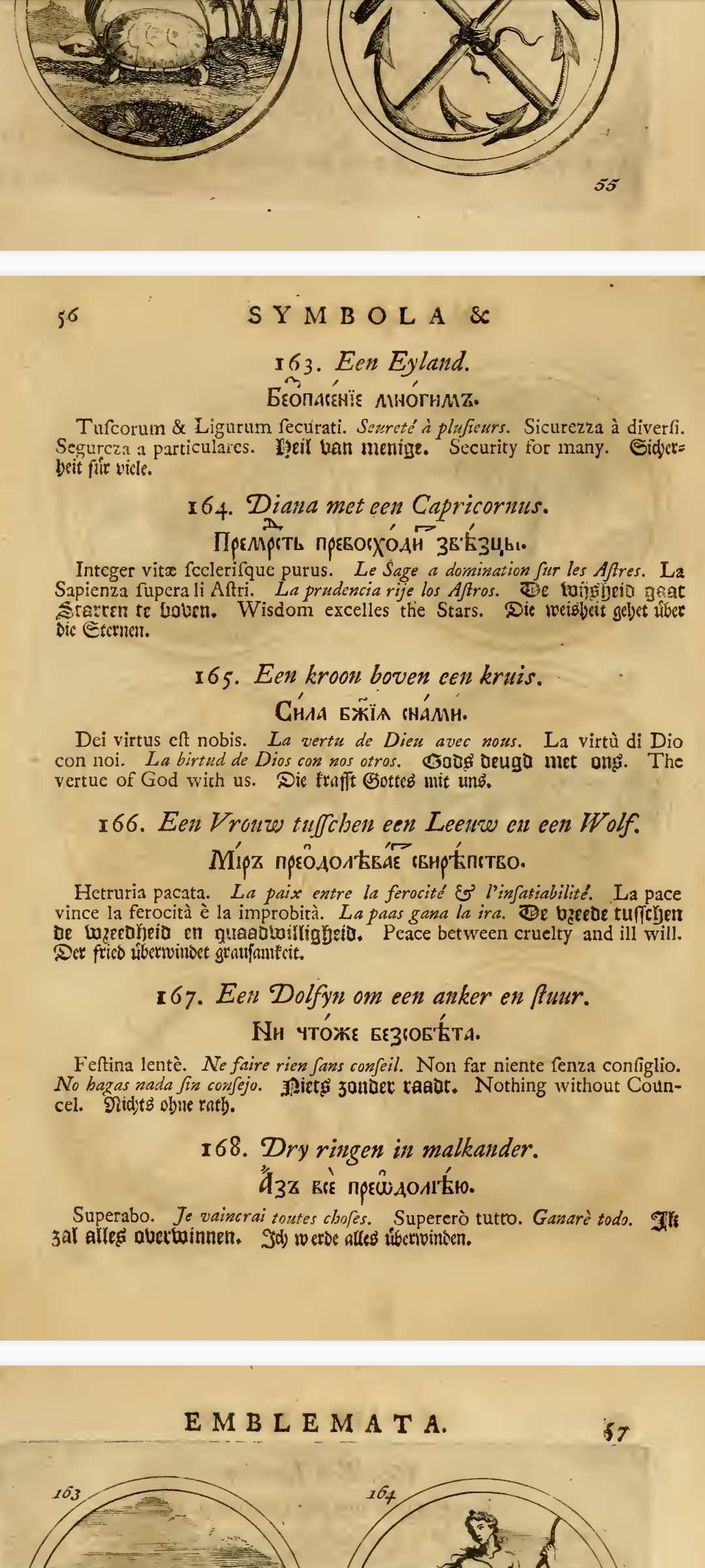 "«Си́мволы и эмблема́та» — сборник изображений символов и эмблем, составленный Яном Тессингом и Ильей Копиевским по указу российского царя Петра I на основе западноевропейских книг аналогичного содержания и напечатанный в 1705 г. в Амстердаме; включает в себя 840 гравированных рисунков эмблем с поясняющими надписями на девяти языках, включая русский."