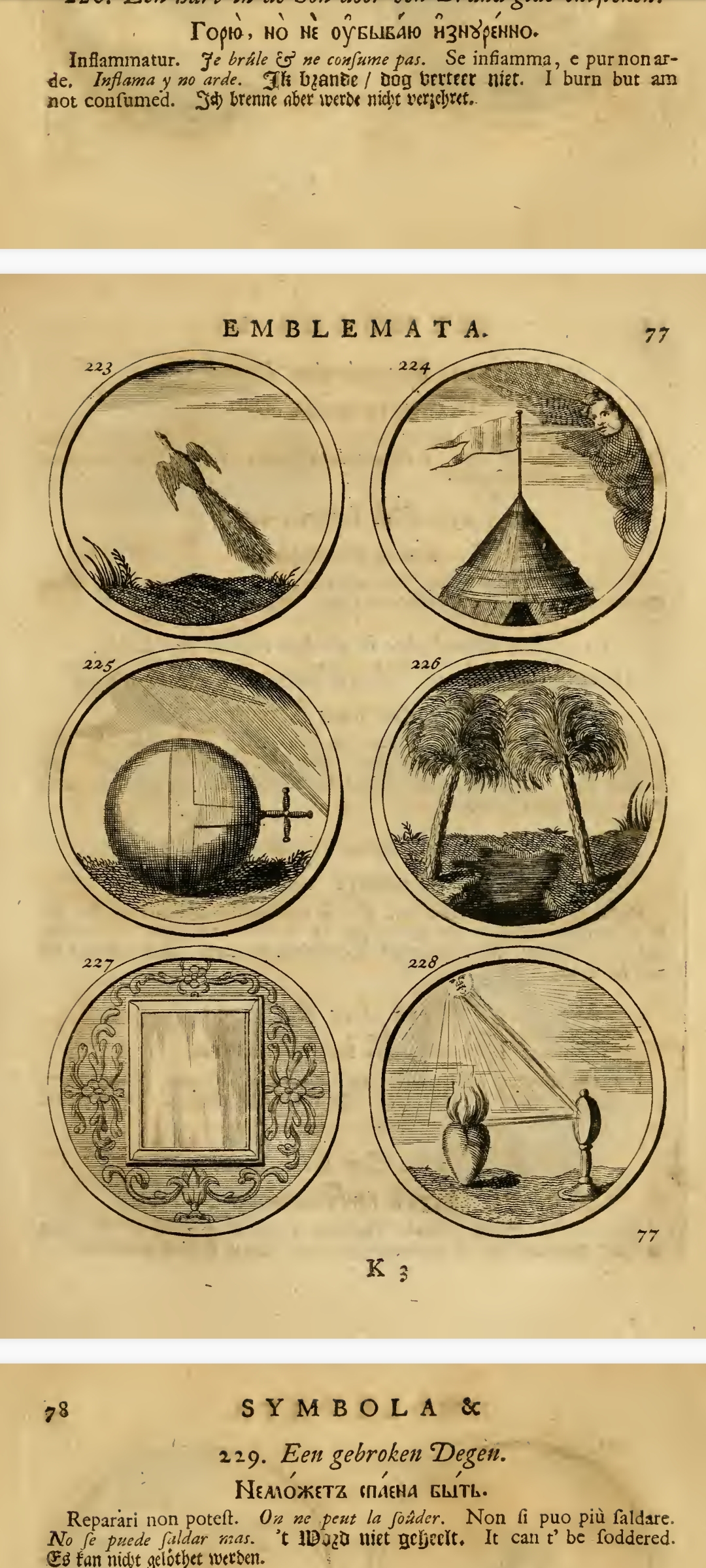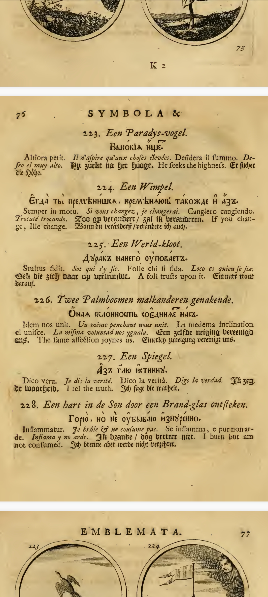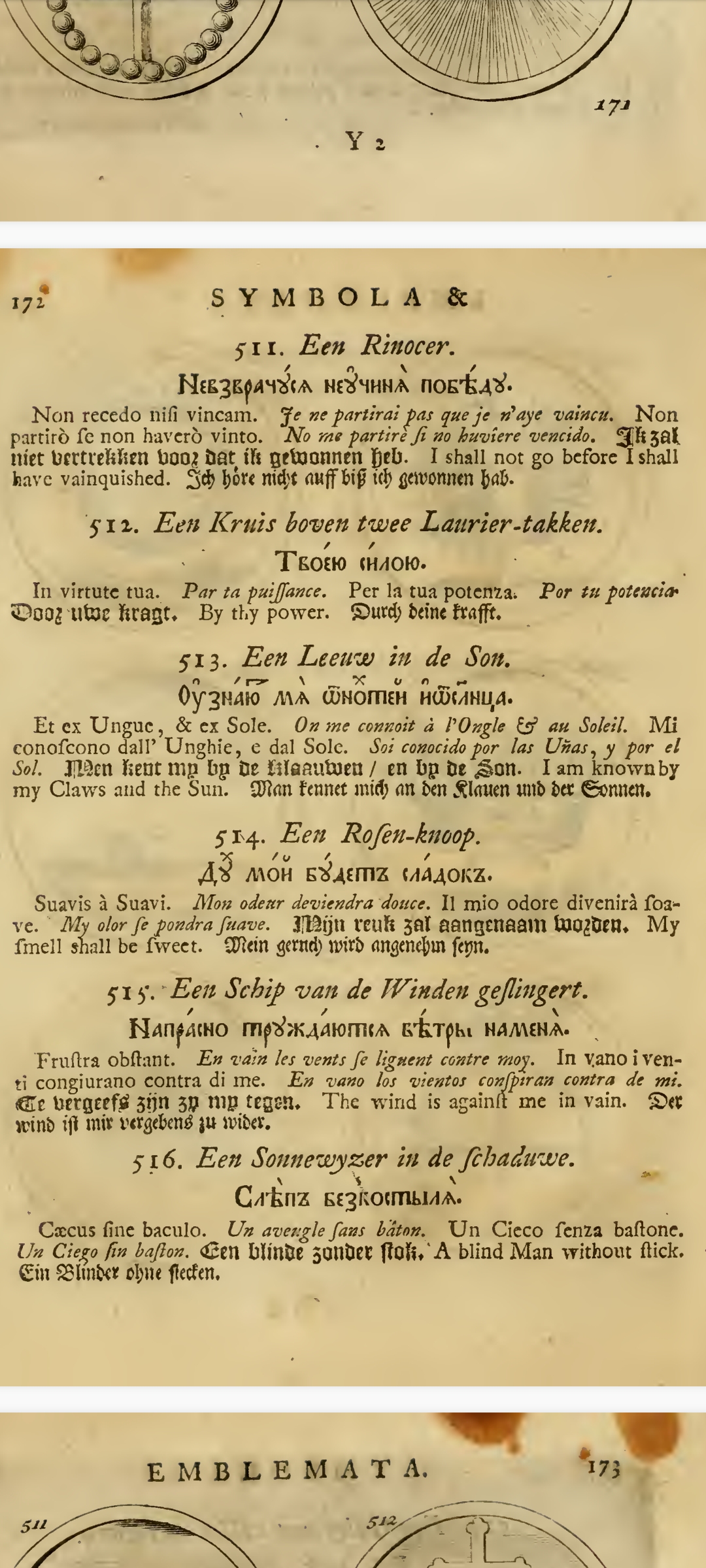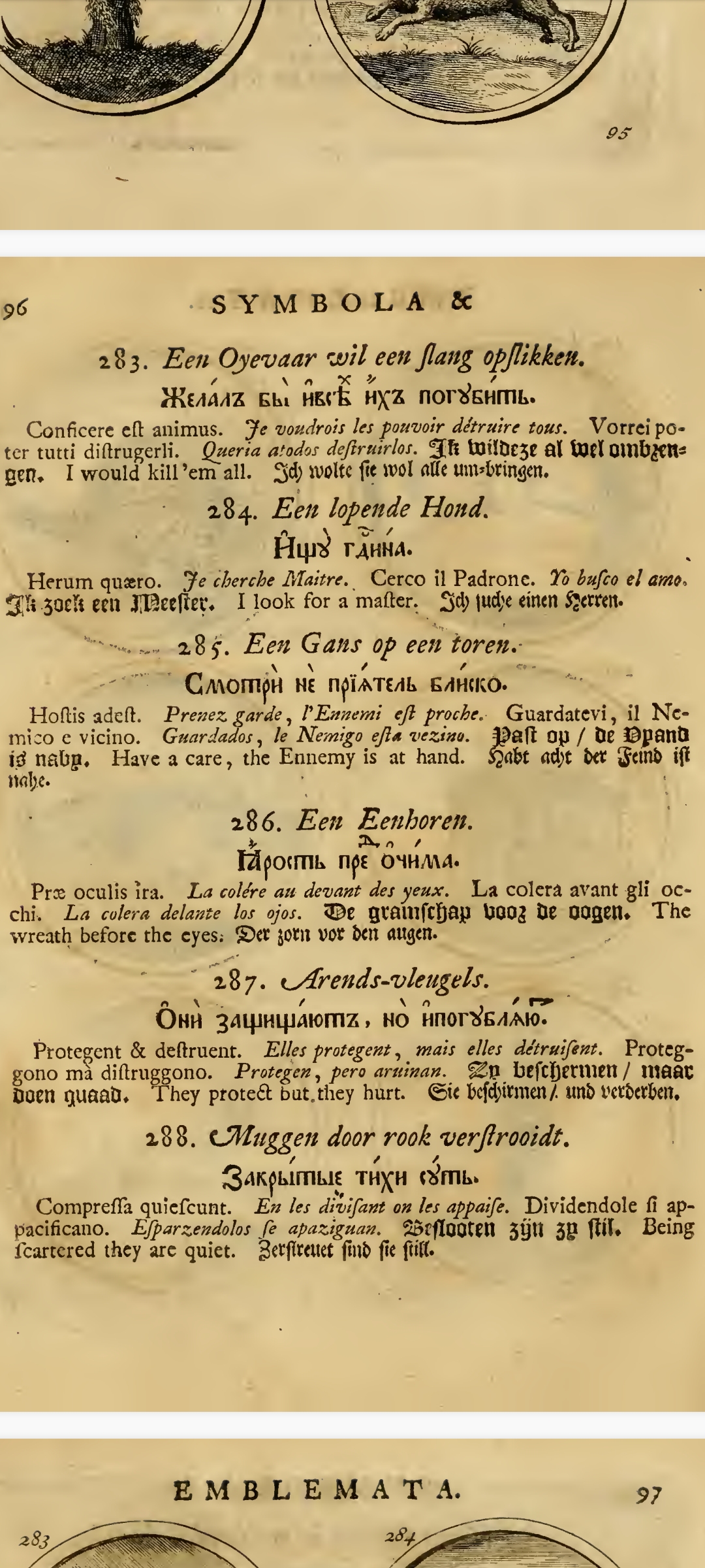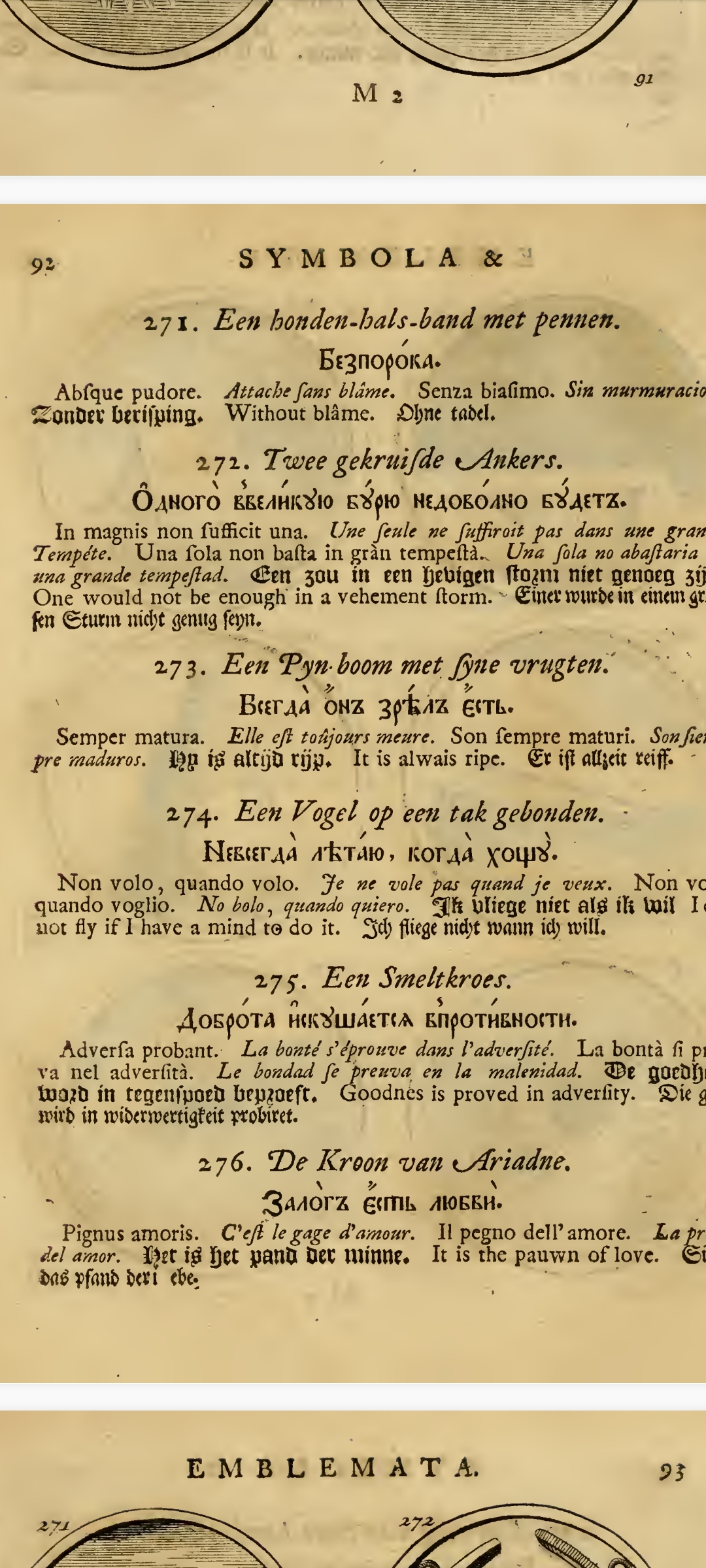 "«Си́мволы и эмблема́та» — сборник изображений символов и эмблем, составленный Яном Тессингом и Ильей Копиевским по указу российского царя Петра I на основе западноевропейских книг аналогичного содержания и напечатанный в 1705 г. в Амстердаме; включает в себя 840 гравированных рисунков эмблем с поясняющими надписями на девяти языках, включая русский."