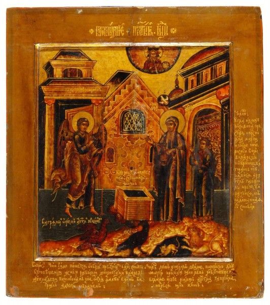 О явлении архангела Гавриила Деве Марии в доме обручника Иосифа в Назарете с известием о рождении Спасителя человечества говорится в Евангелии от Луки.
