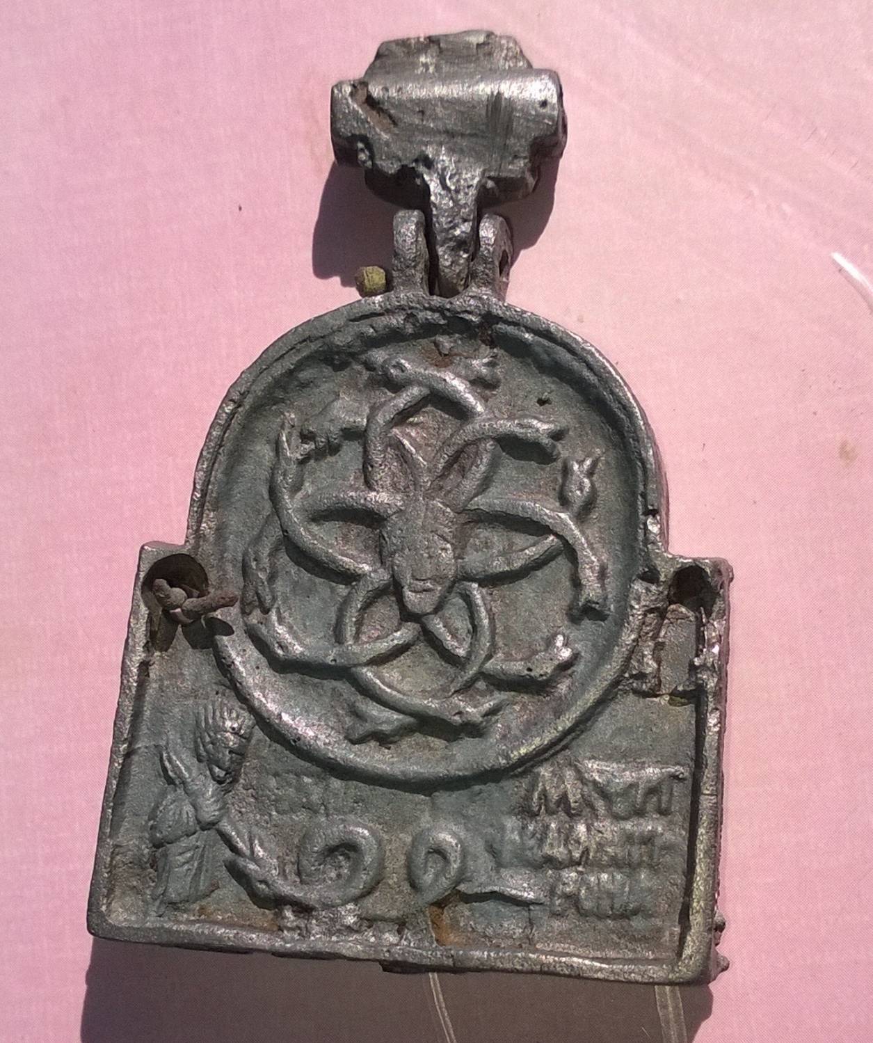 На тыльной стороне в круге "змеиная композиция", изображенная схематично. Ниже круга надпись, нанесенная на форму. На отливке она перевернута: СВЯТЎШИ ХЕРОВИМЪ ... И(С)ЦЎЛИТIЛЪ ВСЎМЪ БОЛЯЩИМЪ Х(РИСТО)СЪ БОГЪ Н(АШЪ). Изилла Плешанова // «Пречистому образу Твоему поклоняемся...». Образ Богоматери в произведениях из собрания Русского музея. СПб. 1995. С. 289.