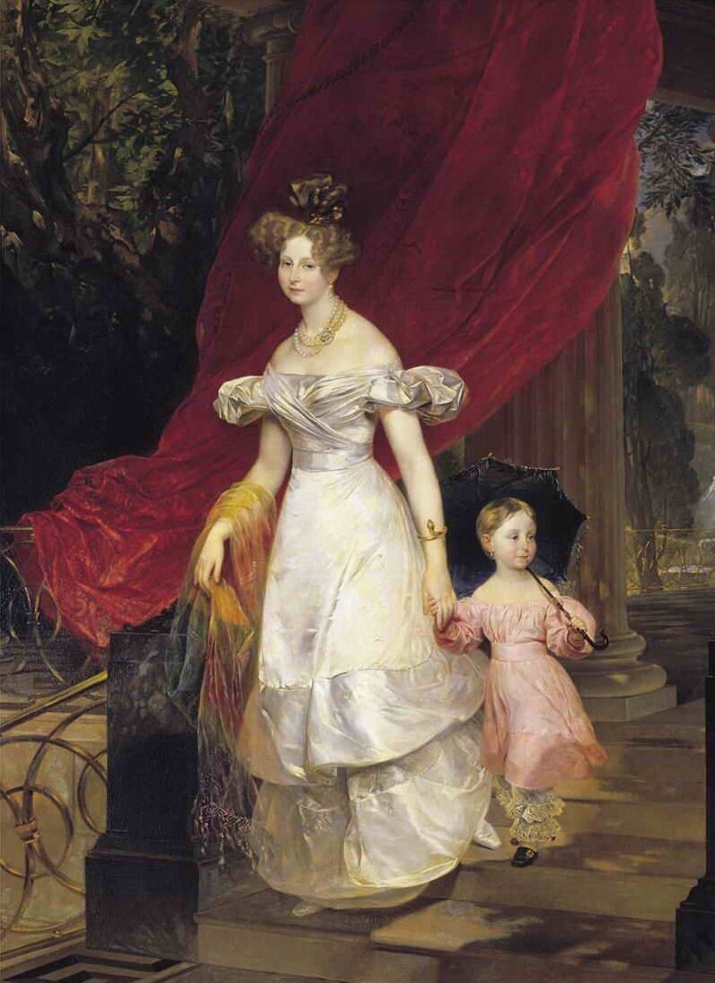 Четыре парадных портрета кисти автора «Помпеи», принадлежащие Русскому музею, ярчайшим образом характеризуют эту сторону творчества гениального живописца. Наиболее ранний из них — «Портрет великой княгини Елены Павловны с дочерью Марией» (1830) — написан в Риме. Парадный портрет в рост требовал особой стилистики, а высокое положение модели —официальной торжественности. В «Портрет Елены Павловны» Брюллов сумел, не нарушая законы жанра, привнести тонкие личностные характеристики: женственность матери, непосредственность и живость ребенка. В портретных характеристиках — от выражения лиц до пластики и походки — много цепко схваченных реалистических деталей: чуть сгорбленная фигура великой княгини, держащей за руки крошечную девочку, сбивчивый шаг ребенка, не поспевающего за ритмом движения матери… Все эти детали придают портрету необычайную убедительность. Необыкновенное личное обаяние Елены Павловны, о котором вспоминали современники, ощутимо в ее характеристике на брюлловском портрете, изощренно сочетающем лиризм и торжественность. Григорий Голдовский. Живопись Карла Брюллова в собрании Русского музея // Карл Павлович Брюллов. СПб, 1999. С. 14-15.