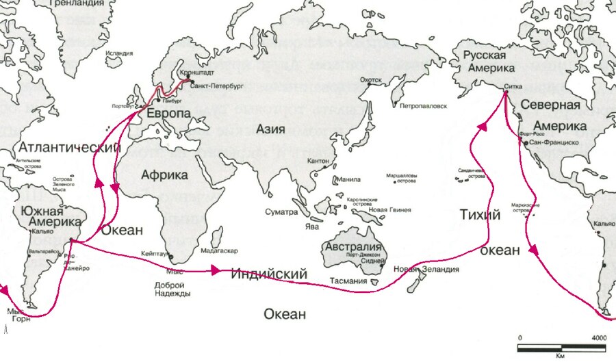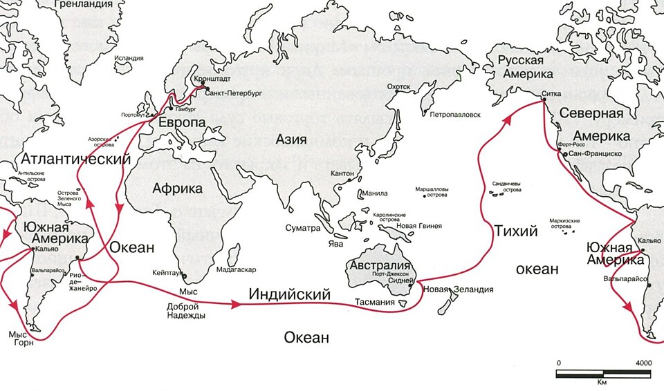 Маршрут кругосветного плавания М. П. Лазарева на фрегате «Крейсер» в 1822—1825 гг.