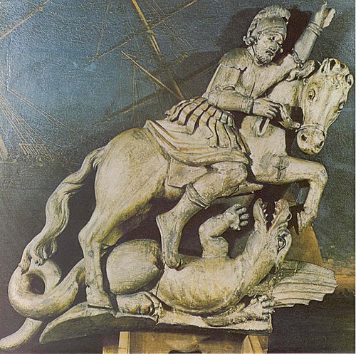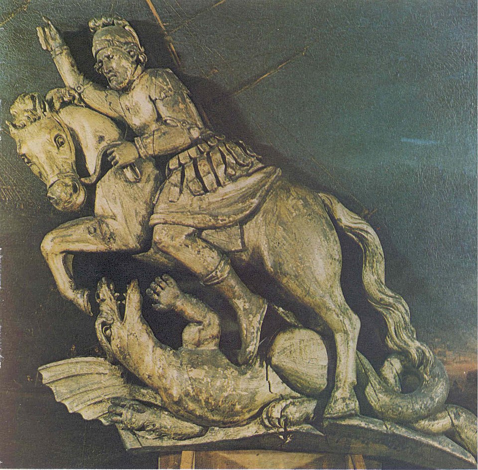 Фрагменты кормового декора «Полтавы» в виде зеркально-симметричных конных скульптур Георгия Победоносца
