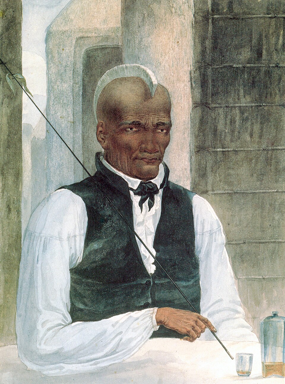 Камеамеа, король Сандвичевых островов. Портрет Камеамеа работы русского художника Михаила Тиханова, 1818 год. Король обрил голову в знак траура по сестре, умершей накануне. На заднем плане — «королевский дворец» в Коне.
