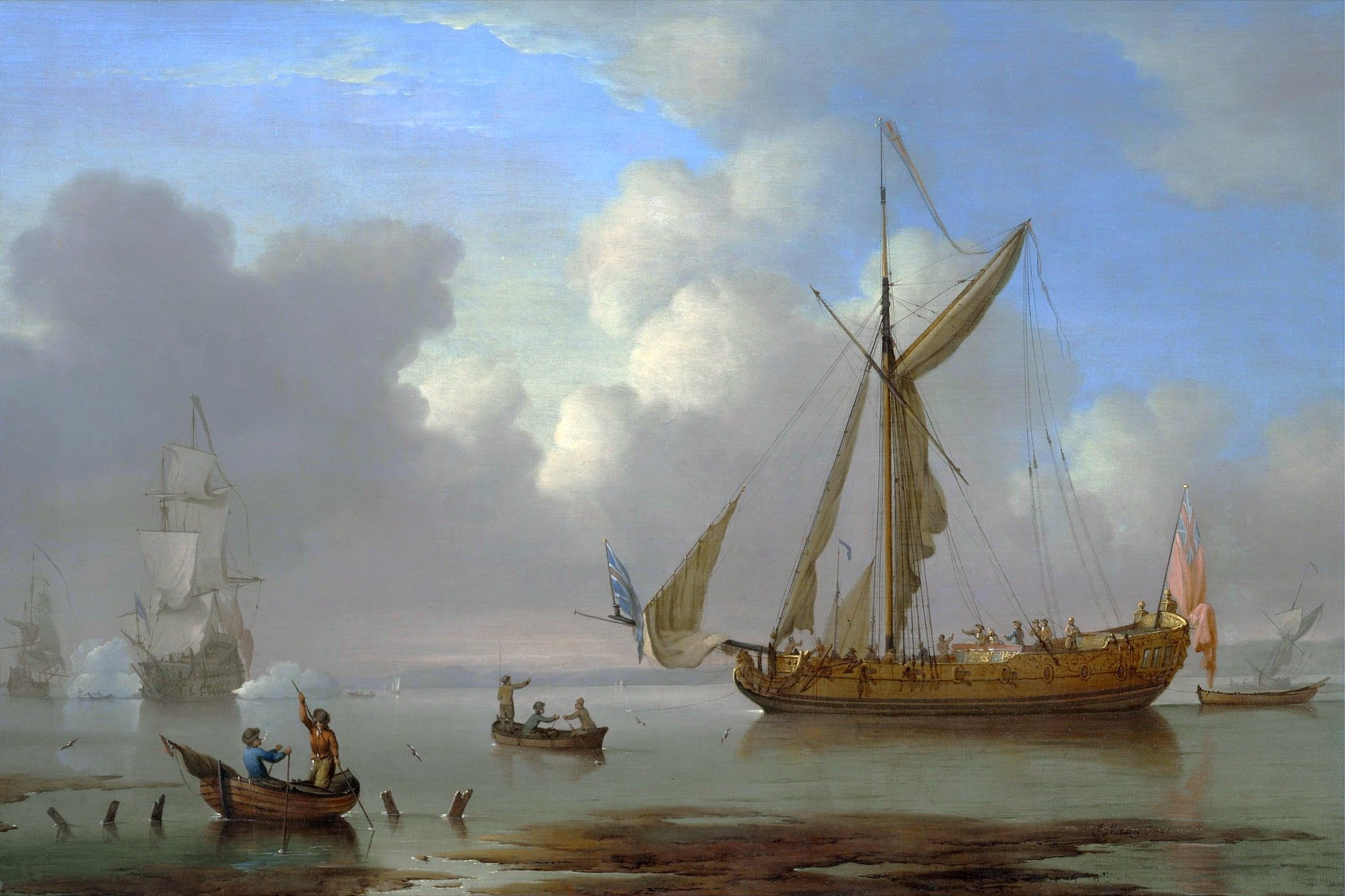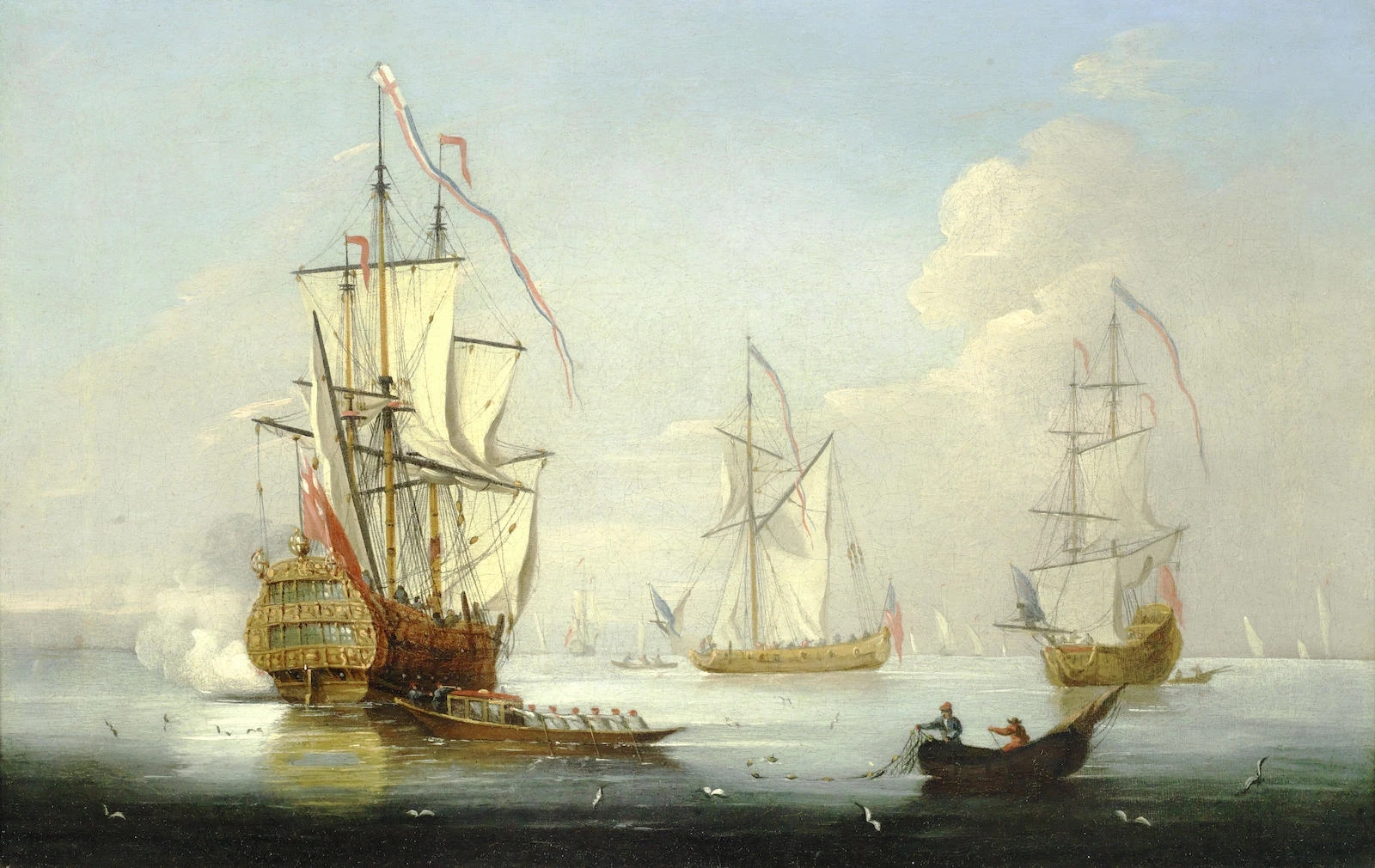 Адмиралтейская яхта проходит мимо большого судна East Indiaman, за которым следуют другие суда.