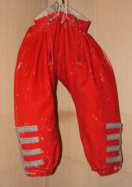 "Штаны к мундиру капитана Преображенского полка сшиты из красного сукна в начале XVIII века и отделаны серебряной тесьмой и пуговицами. Подкладка изготовлена из белого шелка."