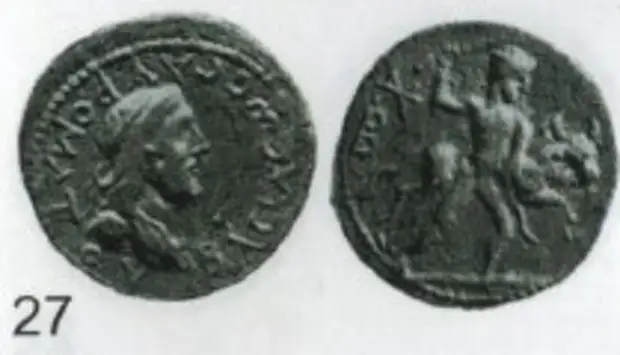 Среди проиллюстрированных на боспорских монетах подвигов Геракла: убийство Лернейской гидры; ловля Эриманфского вепря; очистка Авгиевых конюшен; убийство Стимфалийских птиц, пожиравших людей; одоление критского быка (рис.27); похищение на о. Эрифия коров Гериона; похищение золотых яблок Гесперид. Возможно, что были и другие подобные монеты с остальными подвигами Геракла. Исключать такую возможность нельзя, поскольку монеты очень редкие, последняя из них с новым сюжетом была найдена сравнительно недавно, в 1983 г. при раскопках боспорской крепости Илурат.