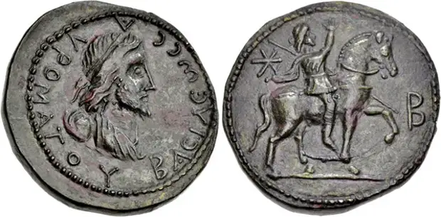 Следующий боспорский царь — Савромат II (174-210 гг.), сталкнулся с теми же проблемами, что и его предшественник. Он проводил активную внешнюю политику: восстанавливал крепостные оборонительные сооружения городов, воевал с варварами и морскими пиратами Понта Эвксинского. Все это требовало больших средств. Продолжалась порча золотых монеты, содержание золота в статерах при царе Савромате II достигло не более 30-15%. В 186 г. царь провёл денежную реформу, введя новые номиналы бронзовых монет: денарий, двойной денарий, двойной сестерций и драхму (рис.26).