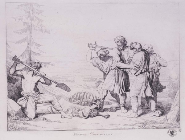 Датируется по покрою костюмов и форме причесок. Начало 1830-х