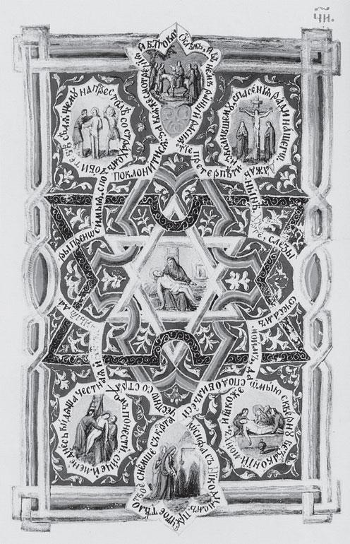 "Рис. 4.49 Страница из «Молитвослова княгини М. П. Волконской». Снятие Христа с креста изображено внутри шестиконечной звезды Давида. По-видимому, в XIX веке еще сохранялась традиция связывать Давида и Христа. "