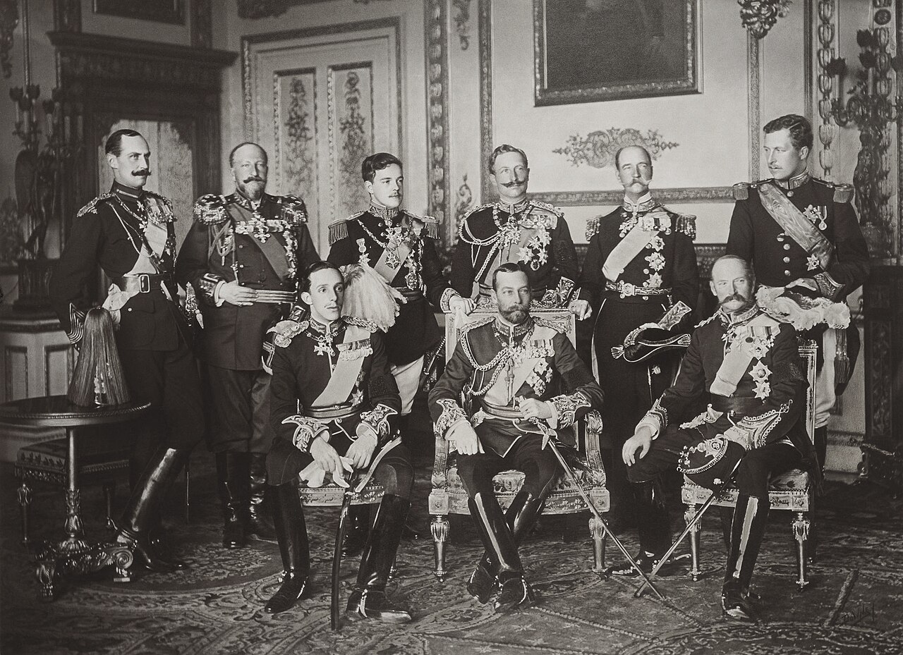 Девять монархов в Виндзоре на похоронах короля Эдуарда VII, фотография от 20 мая 1910 года. Стоят, слева направо: король Норвегии Хаакон VII, царь Болгарии Фердинанд I, король Португалии Мануил II, кайзер Германии Вильгельм II, короли Греции Георг I и Альберт I Бельгийский. Сидят, слева направо: короли Испании Альфонсо XIII, Соединенного Королевства Георг V и Фридрих VIII Датский.