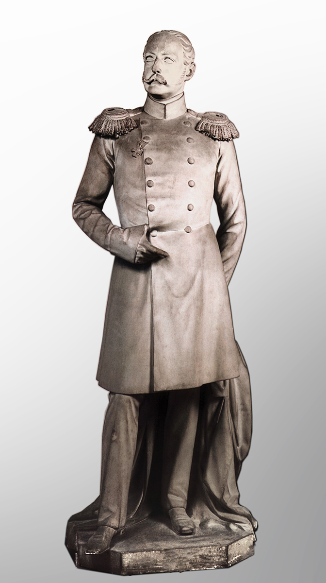 «В 1865 году поручено было мне Его Высочеством Государем Императором исполнение мраморной статуи в настоящую величину в Бозе почившего императора Николая Павловича для парка в Александрии близ Дворца»,— писал в своей автобиографии скульптор Р. К. Залеман 1. 16 июня 1868 года статуя была установлена у дворца Коттедж близ Петергофа. Гипсовый отлив, по которому статуя Николая I высекалась из мрамора, в 1898 году был передан из Академии художеств в Русский музей императора Александра III.